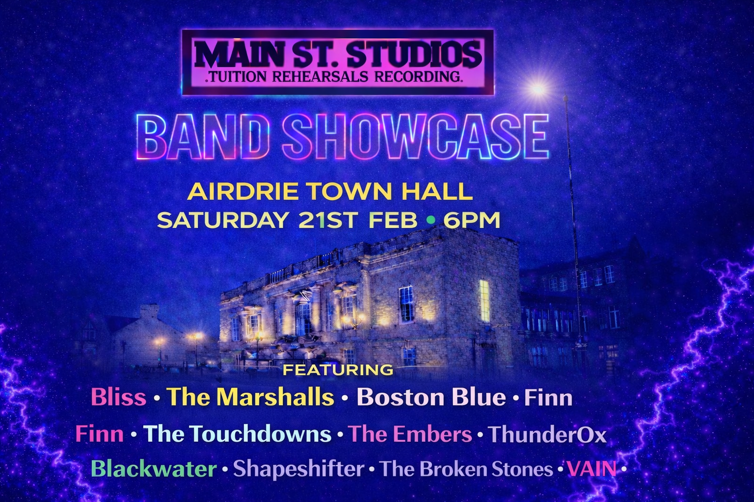 Get ready for a jam packed night of live music as Main St Studios presents its highly anticipated Band Showcase at Airdrie Town Hall! Taking place on Friday 21st February, this special event will feature nine of the most exciting up-and-coming young bands from across Lanarkshire. Don’t miss your chance to witness the future of Scotland’s music scene.