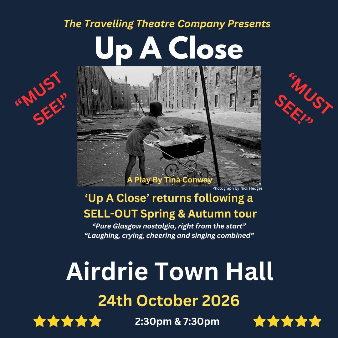 Following multiple SELL OUT runs in 2023 and 2024 and 2025 and two SELL OUT performances at Glasgow’s iconic Pavilion Theatre, UP A CLOSE is coming to the fabulous Town Hall Theatre, Airdrie